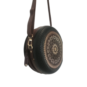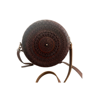 Ma Fierté Lotus Bloom Mandala Carved Teak Wood Round Crossbody Bag – Brown Edition