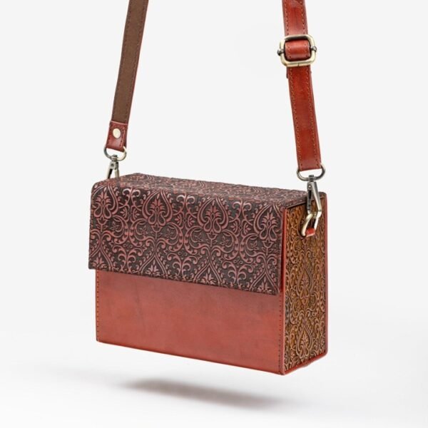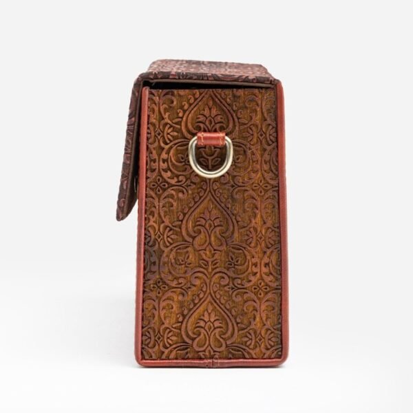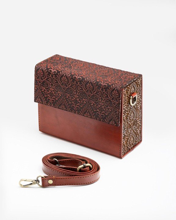 The Ma Fierté Teak Luxe Brown Edition is a beautifully handcrafted crossbody clutch made with solid carved teak wood and carved premium leather. Designed in rich brown tones, this piece blends warm natural wood textures with detailed engraved leather patterns across the flap and side panels. Its structured silhouette, refined finishing, and detachable leather strap make it a timeless accessory suitable for both special occasions and elevated everyday wear.