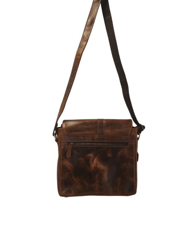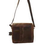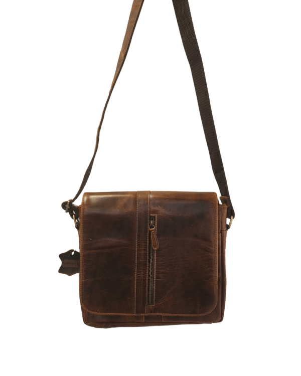 A stylish, unisex messenger bag handcrafted from high quality genuine leather in a warm vintage tan shade. Designed for easy everyday carrying, it features a flap-front silhouette with zipper pockets for quick organization and an adjustable strap for comfortable crossbody wear.