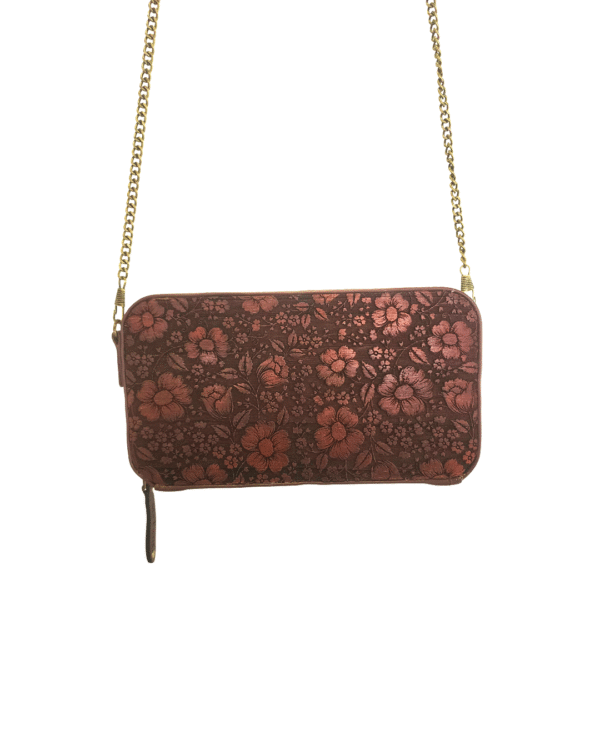 A sophisticated fusion of craftsmanship and elegance — this hand clutch features a beautifully carved teak wood front panel, a smooth plain teak wood back, and premium leather side support, paired with a brass-coated metal chain for a refined carry experience. Designed for occasions that demand style without compromising practicality.