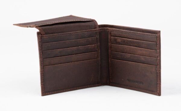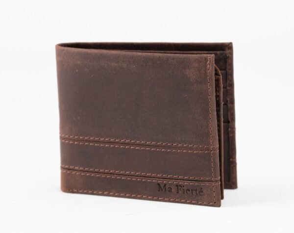 Crafted from 100% genuine leather, this rustic brown bi-fold wallet from Ma Fierté blends rugged charm with modern functionality. Designed with a dual-stitch exterior pattern, it exudes sophistication while maintaining durability for everyday use. With multiple card slots, compartments, and a secure coin pocket, it provides a perfect balance of style, space, and practicality.