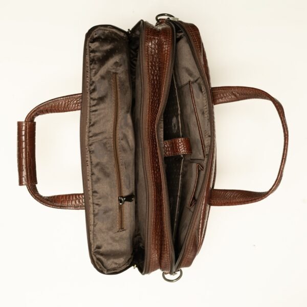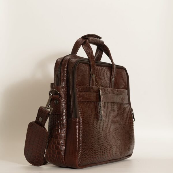 This Ma Fierté laptop bag is crafted from 100% genuine leather with an elegant crocodile-embossed texture, making it a perfect blend of luxury and practicality. Designed for professionals, it features dual compartments, multiple pockets for organization, and premium metal fittings for long-lasting durability. Its structured design ensures your laptop and documents are well-protected while adding a touch of sophistication to your work attire.