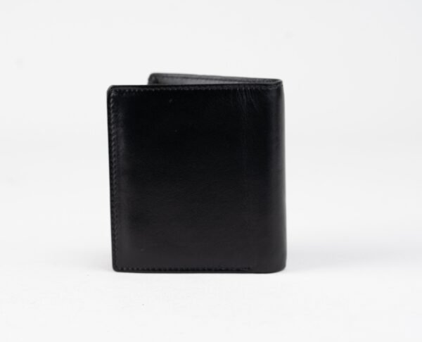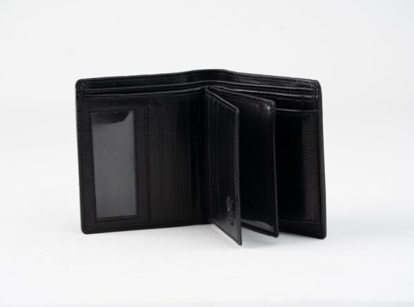 The trifold layout ensures easy organization of your cards, cash, coins, and IDs. The interior is thoughtfully arranged with multiple card slots, a clear ID window, and a secure coin pocket. The wallet’s black color with a sleek, polished leather finish gives it a timeless look that suits any occasion, whether formal or casual.