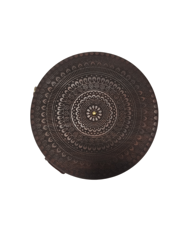 This artistic piece is meticulously crafted from solid carved teak wood, paired with premium leather side panels and a durable leather strap. The mandala-inspired carved pattern on the wood front adds a striking, timeless aesthetic, making it a standout accessory for any occasion.