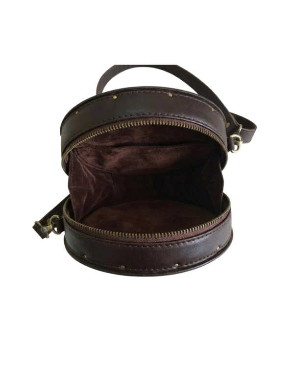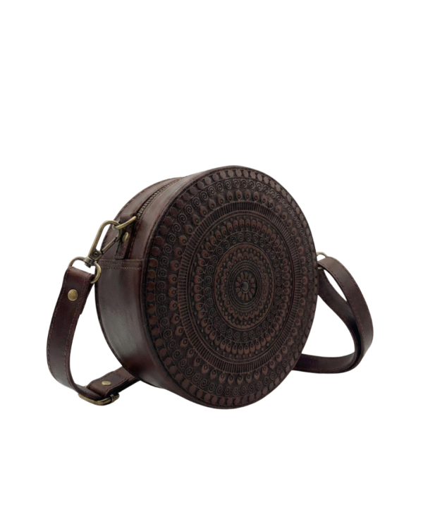 Ma Fierté Handcrafted Carved Teak Wood & Leather Round Crossbody Bag – Brown Edition