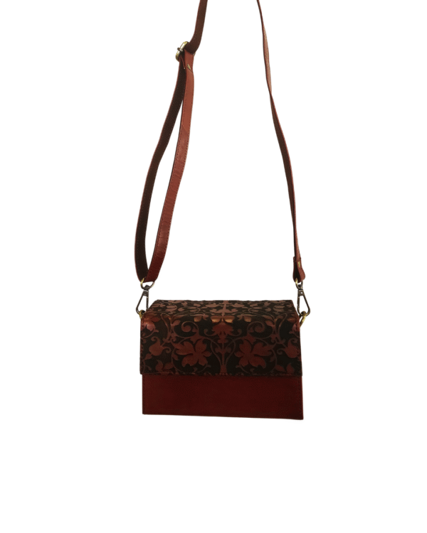 The Ma Fierté Imperial Vine Carved Leather and Wood Crossbody Bag is a refined, handcrafted accessory designed for those who appreciate artistry and structure. Featuring a beautifully carved leather flap paired with a smooth wooden base, this compact silhouette blends old-world charm with modern practicality. Its soft suede interior, magnetic closure, and adjustable leather strap make it an elegant and functional choice for daily wear or special occasions.