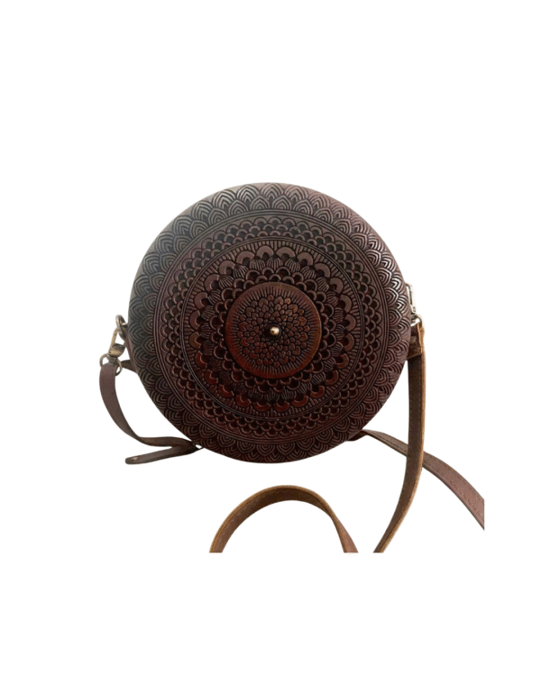 Ma Fierté Lotus Bloom Mandala Carved Teak Wood Round Crossbody Bag – Brown Edition