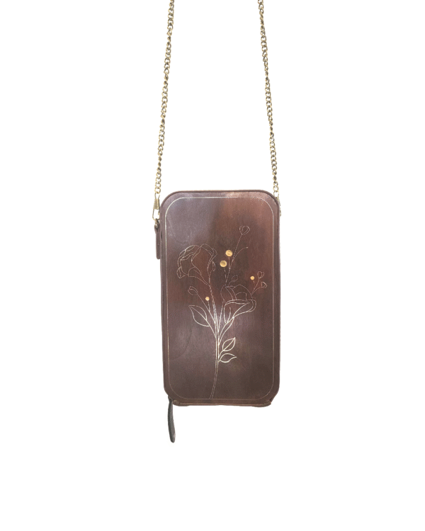An elegant fusion of craftsmanship and modern artistry — this vertical hand clutch showcases a stunning golden laser-engraved floral motif on rich teak wood. Designed for those who love minimal elegance with a touch of luxury, it features a compact profile, dual-zip compartments, and a brass-coated chain strap for effortless styling.