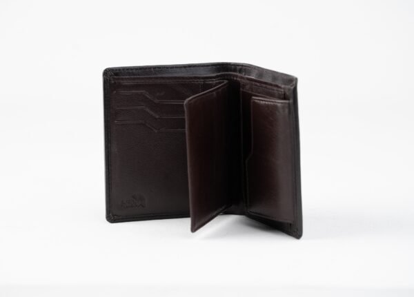 The Ma Fierté Vertical Leather Wallet combines sleek elegance with practical functionality, crafted from high-quality genuine leather for durability and timeless appeal. Designed for the modern individual, this wallet offers a slim profile while maximizing storage efficiency. The vertical layout provides easy access to cards and cash, and its built-in RFID-blocking technology protects against unauthorized scanning of your personal information. Finished in a deep, rich brown, the leather develops a beautiful patina over time, making each wallet uniquely yours.