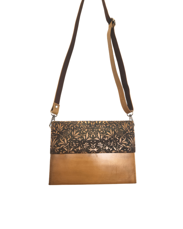 This elegant crossbody bag showcases fine laser engraved floral artwork on genuine leather, creating a rich contrast of texture and tone. The detailed botanical pattern adds depth and sophistication, while the smooth leather body balances the design with a clean, modern finish. Designed for women who appreciate artistic detail and timeless craftsmanship, this bag transitions effortlessly from day to evening use.